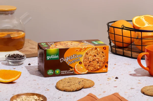 Experimenta já as bolachas Digestive Aveia e Laranja com Pepitas de Chocolate! Deliciosas bolachas elaboradas com óleo de girassol alto oleico, flocos de aveia e pepitas de chocolate negro. Desfruta da combinação do chocolate com o toque cítrico da laranja!